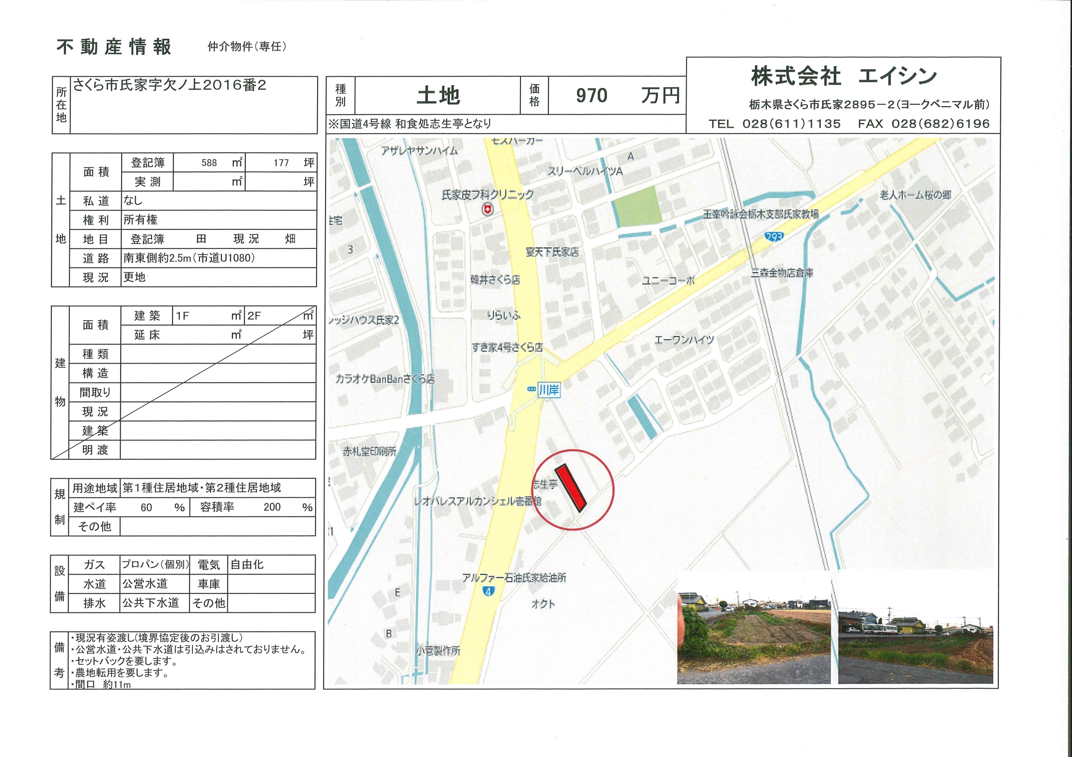 《備考》 現況有姿渡し、上下水の引込工事を要する、セットバック有り、農地転用を要する
