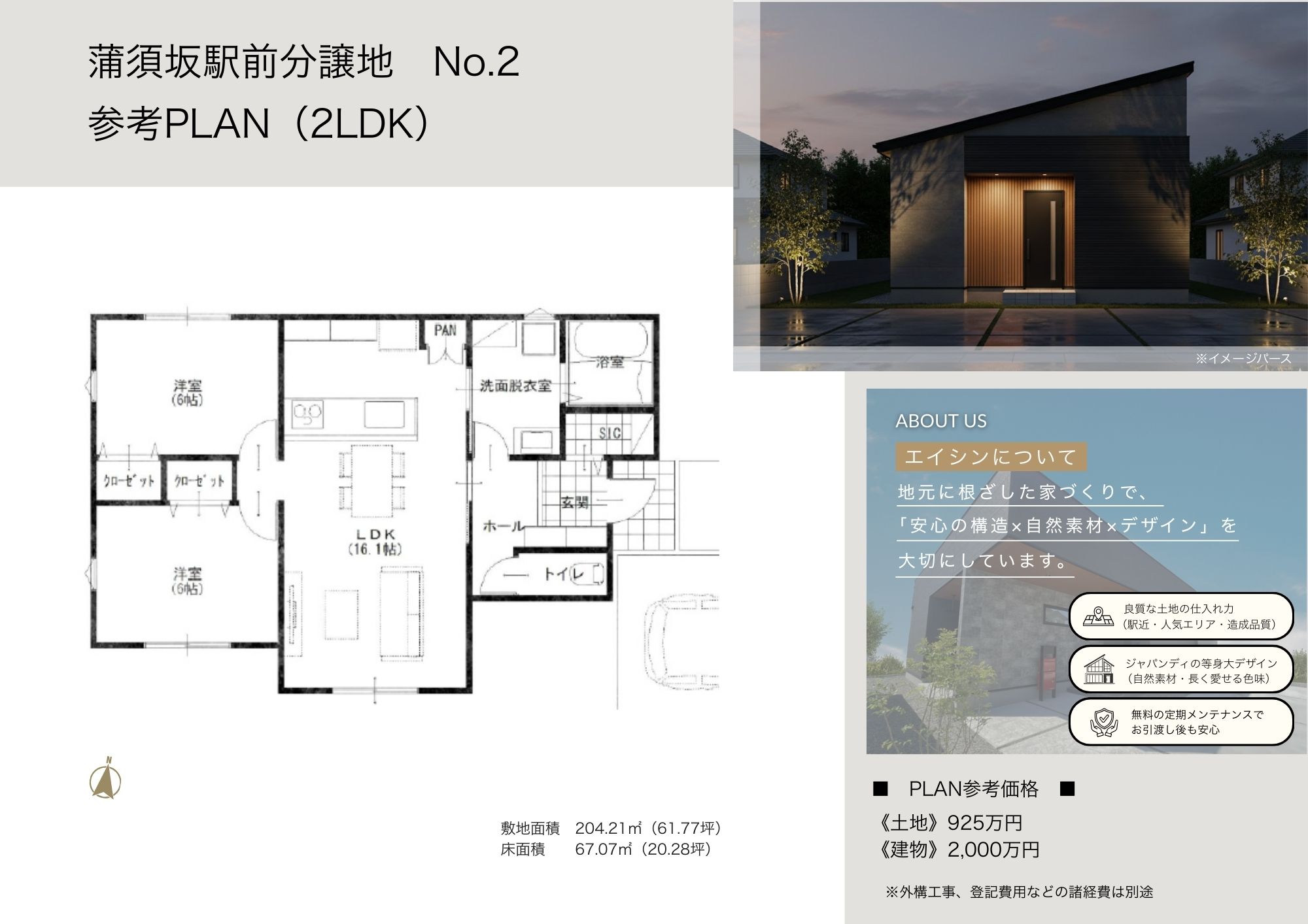 【No.2参考プラン】建物参考価格2000万円、建物面積67.07㎡(20.28坪)