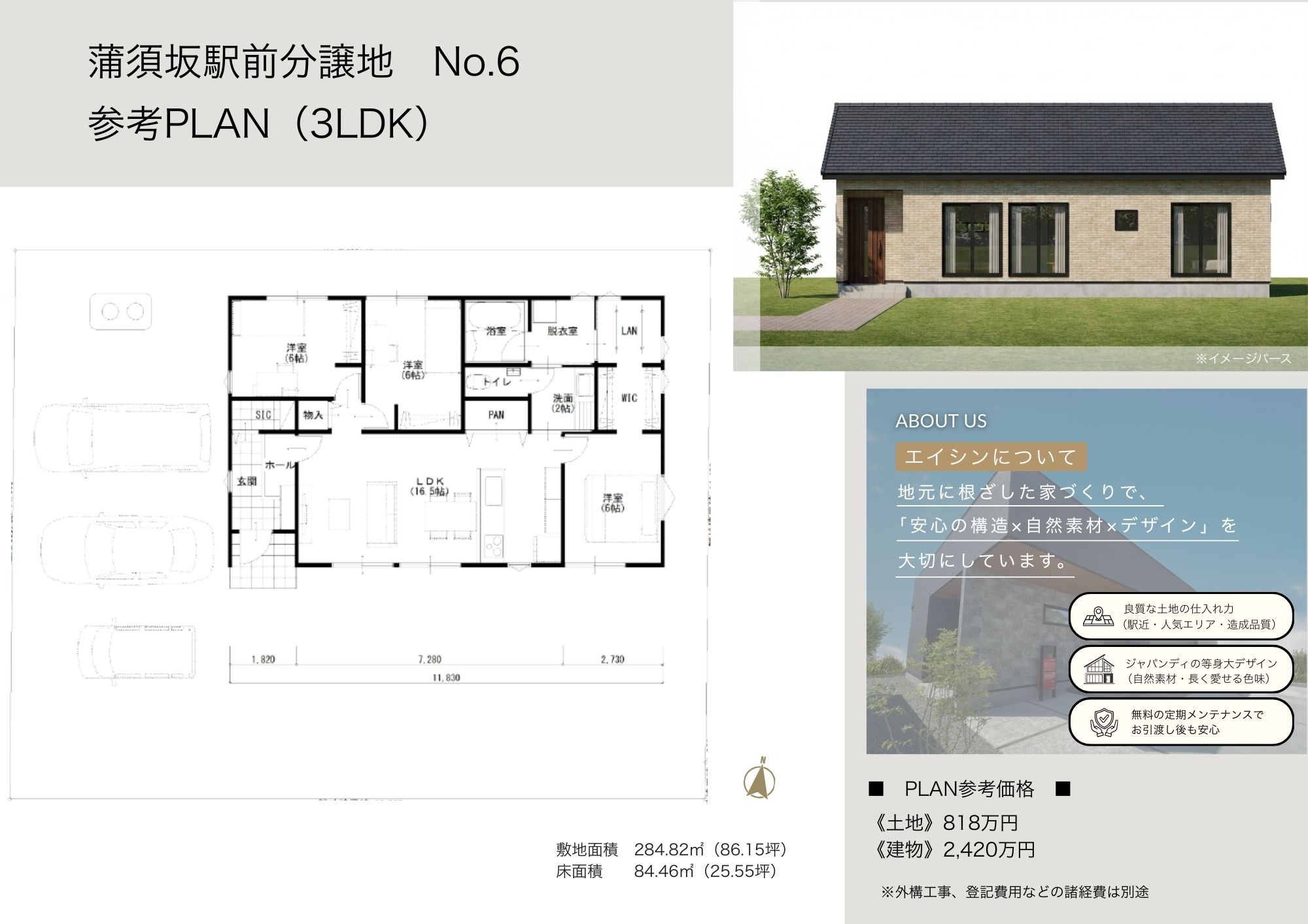【No.6参考プラン】建物参考価格2420万円、建物面積84.46㎡(25.55坪)
