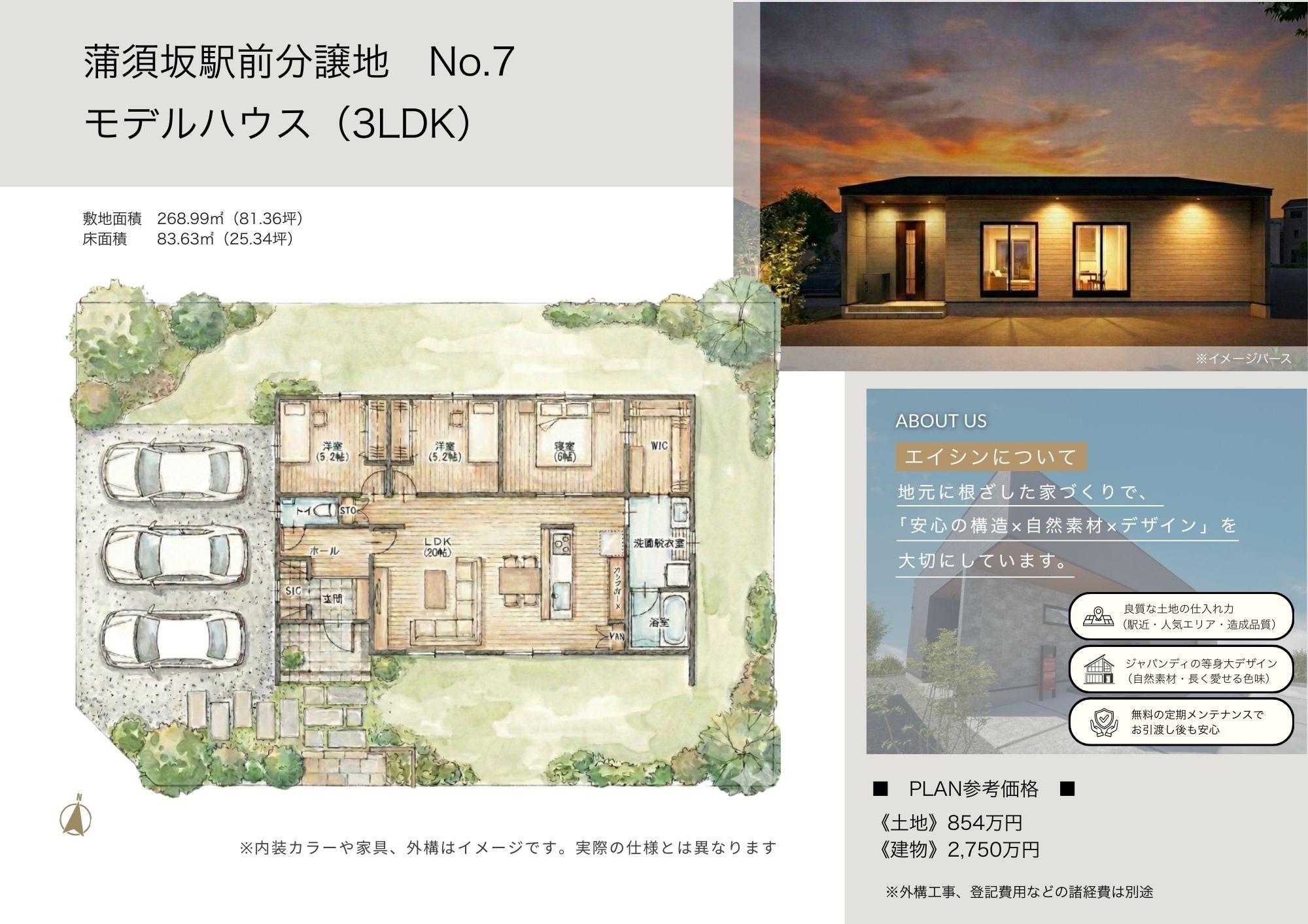【No.7モデルハウス】建物参考価格2750万円、建物面積83.63㎡(25.34坪)
